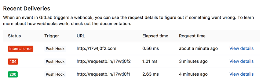 On this page, you can see data that GitLab sends (request headers and body) and data that it received (response headers and body).